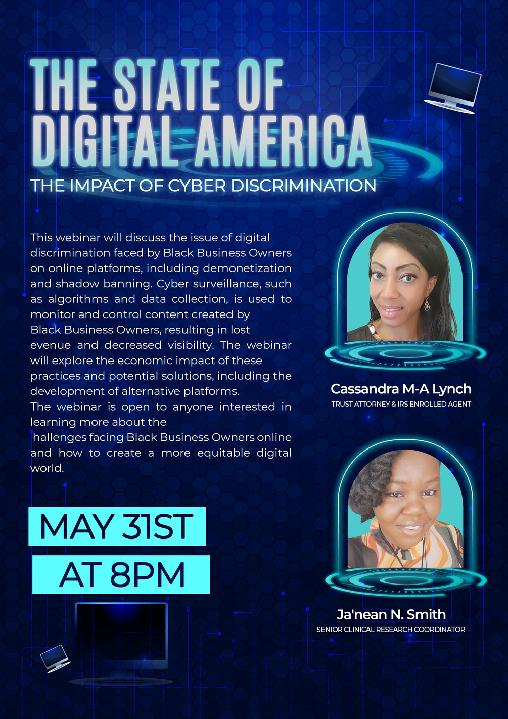 In this webinar, we will explore the phenomenon of digital discrimination, including demonetization, shadow banning, and cyber surveillance, with a particular focus on its impact on black business owners. We will examine how online platforms use cyber surveillance such as, algorithms and data collection, to monitor and control the content created by black business owners, leading to a phenomenon known as demonetization and shadow banning.
